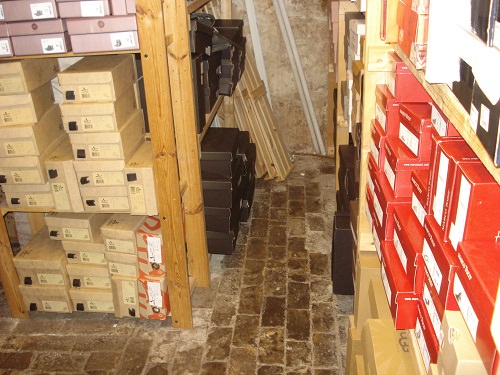 The indoor air humidity in the basement has increased significantly causing dampness on the surfaces of the walls which were subsequently colonised by moulds. Moulds have also attacked the luxury shoes. Following the identification of the cause a quick plan has been put in place to dehumidify the basement and to prevent further damage to the stock.