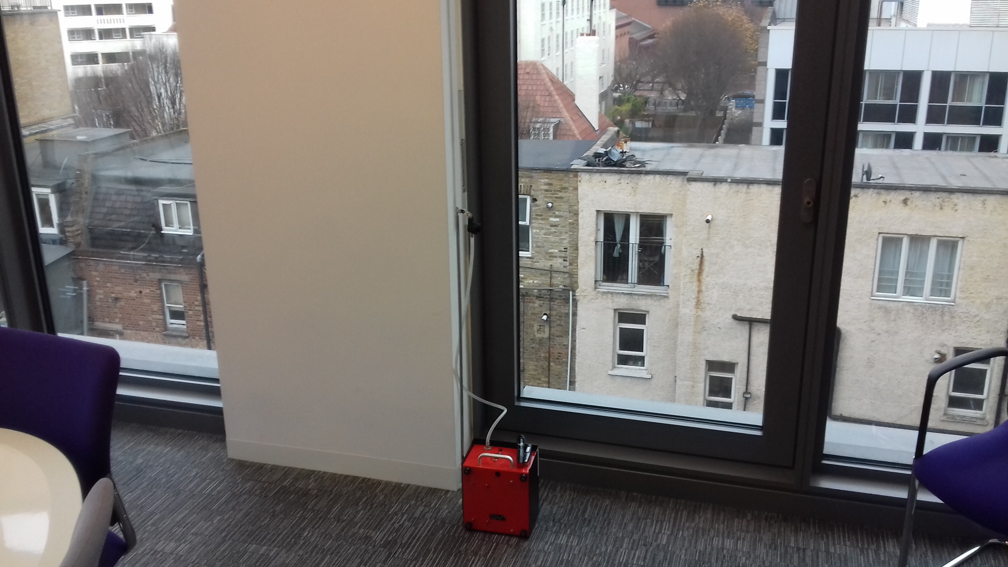 Today we were invited to a nine-story building situated on a busy road in London. The building consists of three individual blocks , one block was used for accommodation and two blocks were used as multi-storey open plan offices. The building complex has a canteen and welfare facilities on the ground floor with open plan offices on the upper floors. The ventilation in the building is provided by a building wide ventilation management system, with the fresh air intakes for the offices situated on the East-North side of the building, towards the properties situated on the neighbouring street. Our client instructed us to carry out an assessment of the indoor air quality in relation to selected chemical contaminants as employees working in the 3rd and 2nd floor of office block 2 had reported intermittent odours related to food preparation, fire and smoke. The employees were concerned about smoke related odours and possible health risks from smoke, however none of these employees had reported adverse health symptoms to indicate that this was the case.