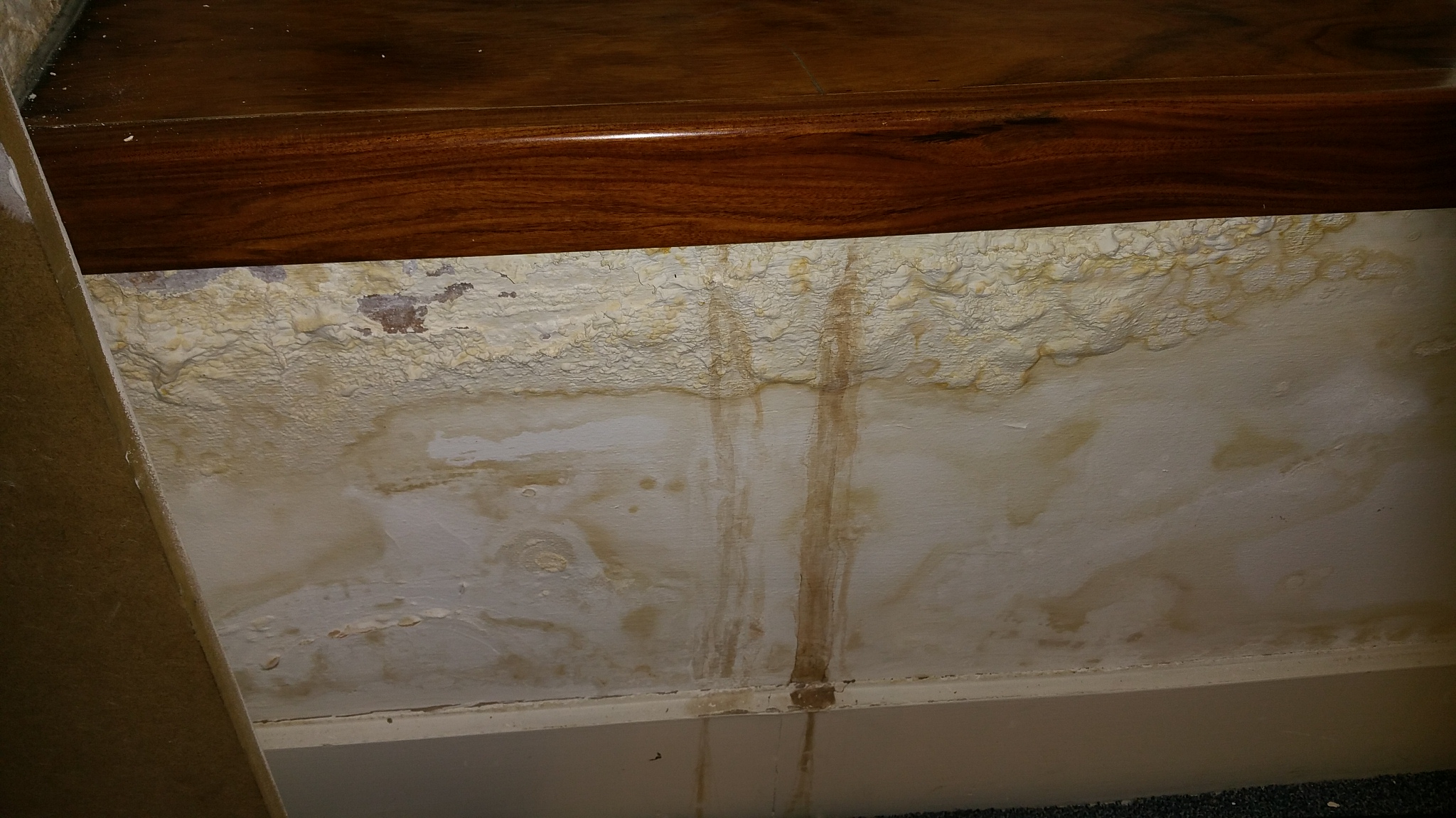 During the office inspection I have also identified penetrating damp to one of the office windows which most likely originated on the upper floor. The corner of the room including window frame and wooden window sills were affected by elevated moisture content. The wall showed signs of water damage, paint flaking and efflorescence. I have not observed any mould growth on the wall itself or wooden windows sill.