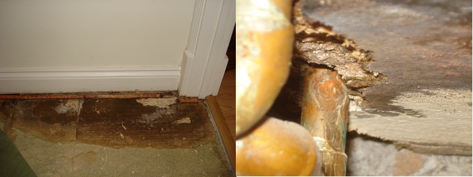 When I lifted the upstairs carpeting I could see the water staining of the floorboard underneath. This was apparently one of the historic minor leaks into the property. When I had a look under the floorboard I could that the damage was a bit more extensive and white wood decaying mycelium was visible on the underside of the floorboards.