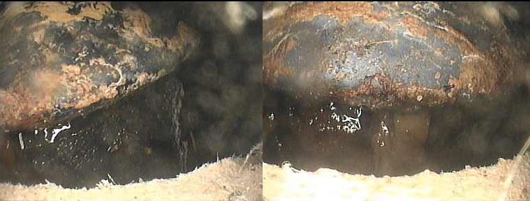 I have made several small access points in the cavity wall to insert my camera and inspect the pipe work. I have discovered wrongly connected sewage pipe at the ceiling level of the bathroom.